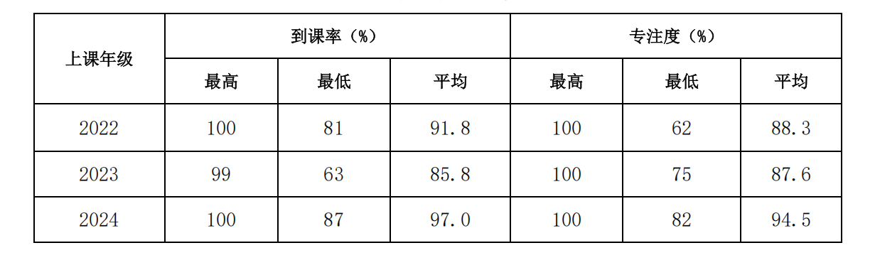 二、不同年级教学班学生到课率、专注度