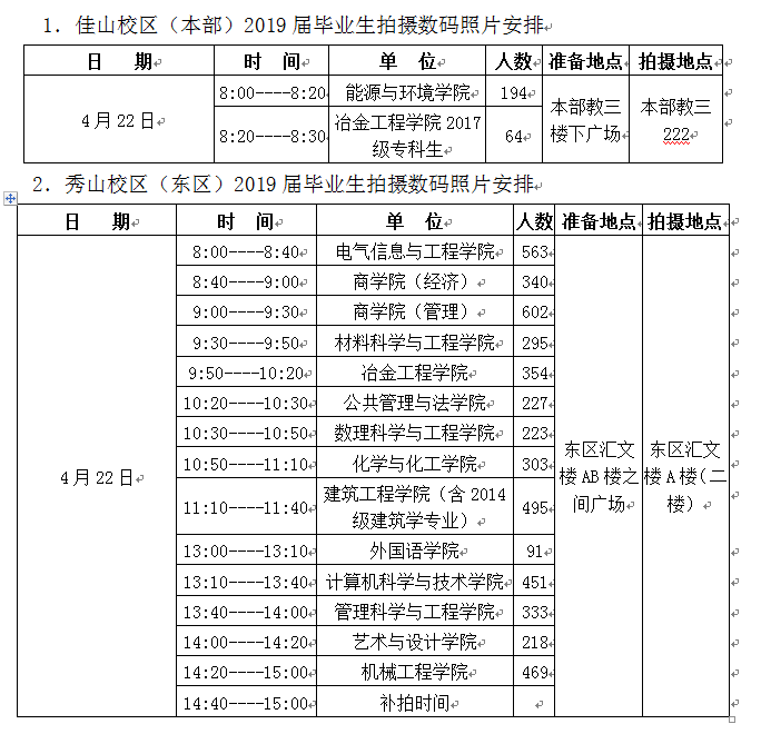 根据学校教学工作安排,兹定于4月22日进行我校2019届毕业生数码照片拍摄工作,所需费用由学校统筹解决。未在规定时间内拍摄费用自理。毕业生数码照片事关毕业、学位证书发放及毕业信息上网注册,请各学院务必高度重视,严格按照《2019届毕业生信息核对表》和本通知的要求,组织本院学生在规定时间内完成照片拍摄工作。
