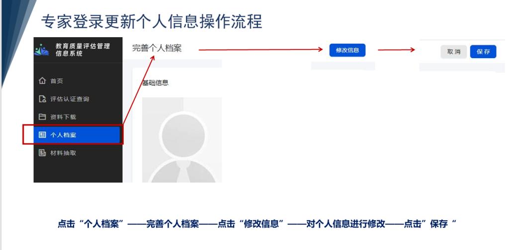 请所有在库评估专家(含项目管理员、秘书)于7月15日前登录教育质量评估管理信息系统(网址:https://eqem.eqea.edu.cn/,可用手机号登录)完成个人信息维护,具体名单见附件1,操作流程见下图。