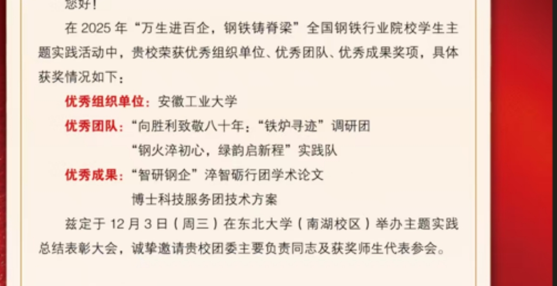 成果获评2025年新时代高校“钢筋铁骨”育人共同体“万生进百企、钢铁筑脊梁”全国钢铁行业院校学生主题